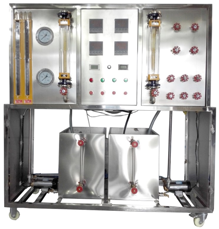 套管式換熱器,板式換熱器,列管式換熱器,冷、熱水防腐水泵,冷、熱水轉(zhuǎn)子流量計,冷、熱水不銹 鋼原水箱及加熱水箱,順、逆流調(diào)節(jié)閥門組,阻力測試壓力表及U型差壓計,加熱功率由固體調(diào)壓模塊無級調(diào)節(jié),萬能信號輸入巡檢儀顯示溫度,電流表,電壓表,不銹鋼臺架及控制屏等。 數(shù)字型增加帶標準信號的多路萬能信號輸入巡檢儀,增加帶標準信號的數(shù)顯電流表電壓表, 增加文丘里流量計配差壓傳感器測流量,軟件等。